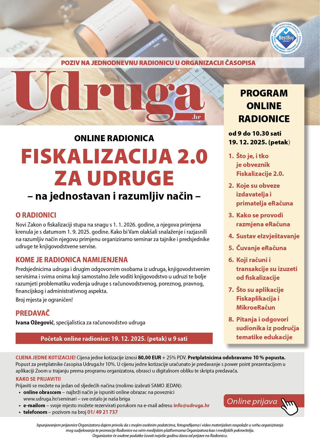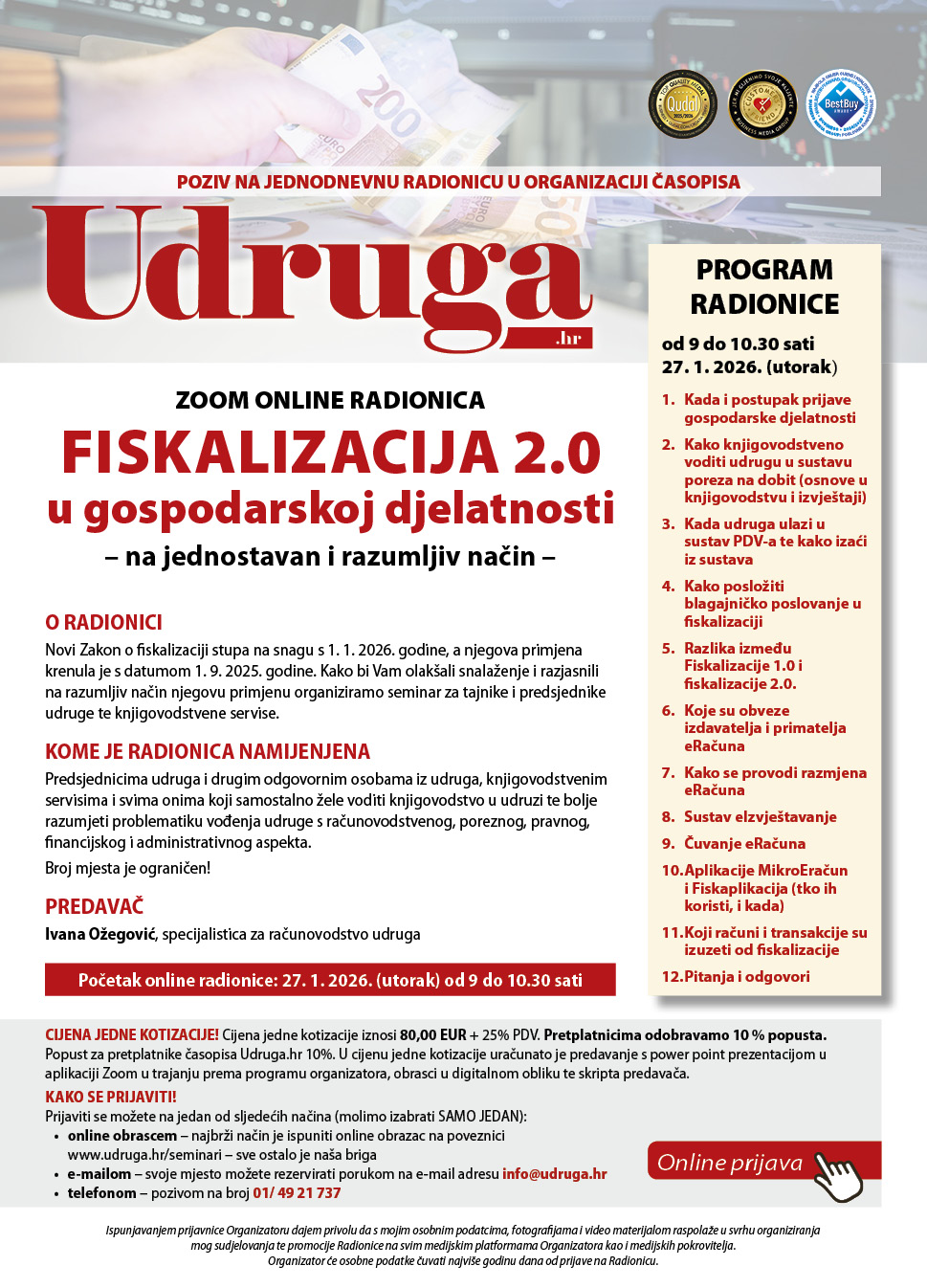 Jednodnevna online radionica namijenjena udrugama, knjigovođama, knjigovodstvenim servisima kao i svima ostalima koji žele savladati područje navedene tematike.