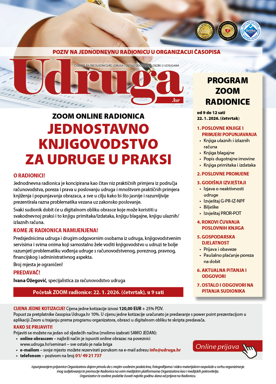 Jednodnevna online radionica namijenjena udrugama, knjigovođama i svima ostalima koji žele savladati područje
