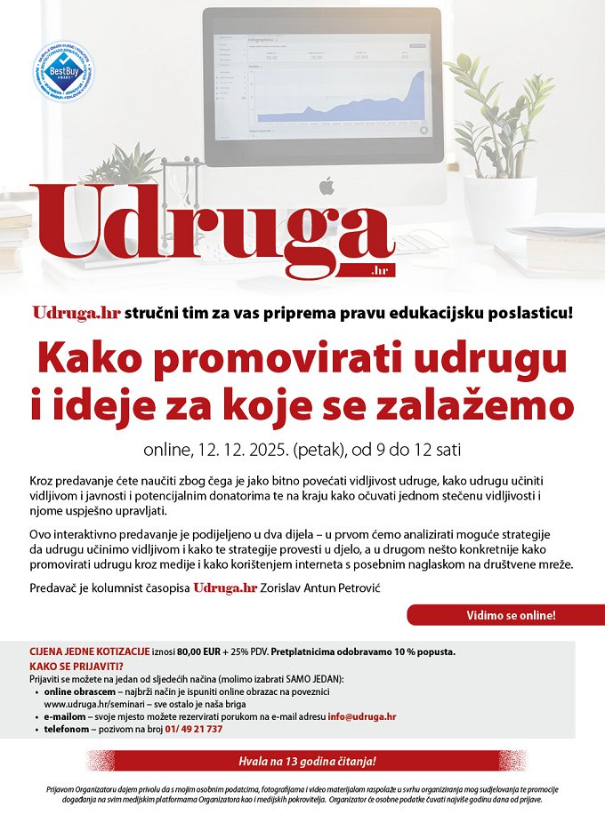 - Cijena: Za pretplatnike časopisa Udruga.hr cijena jedne kotizacije iznosi 100,00 EUR (PDV uračunat).
